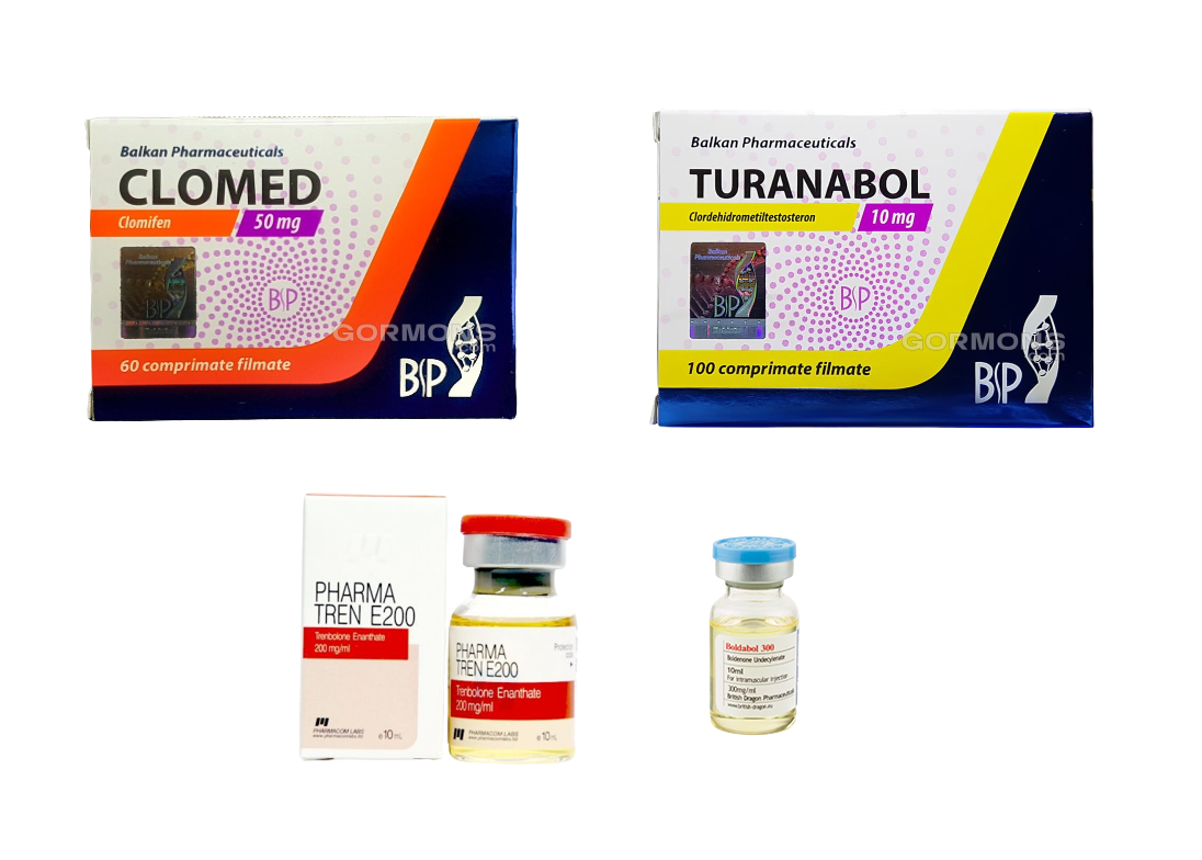 Препараты, входящие в курс: turinabol (100 таб.), boldenone (1 флакон, 10 мл), trenbolone enanthate (1 флакон, 10 мл), clomed (20 таб.)